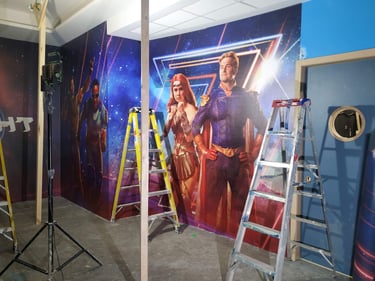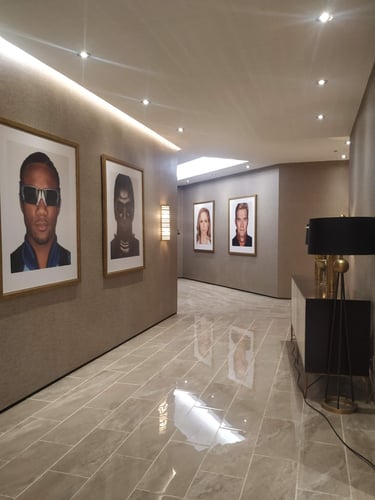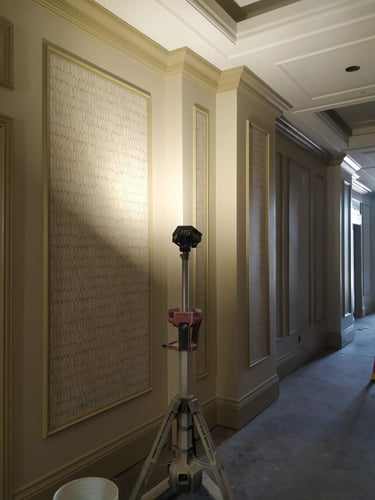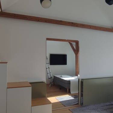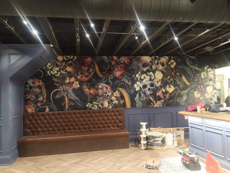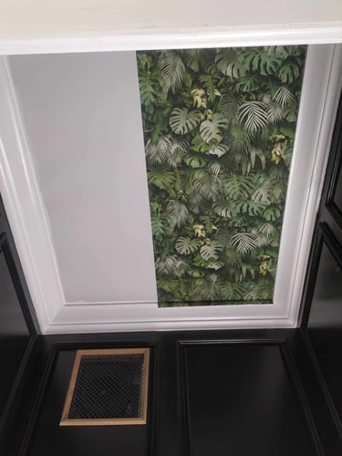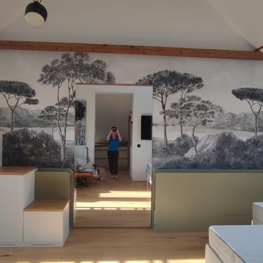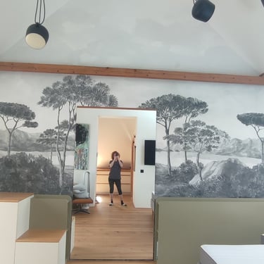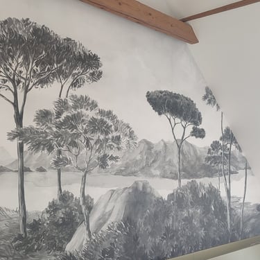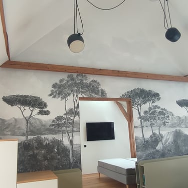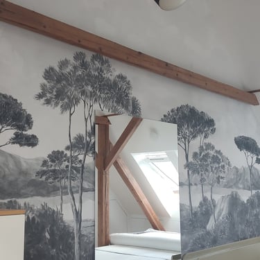 Naprosto nádherný výběr tapety! Klientka vybrala Francouzskou krajinu v černé barvě. Spodní část pod trámem je aplikovaná. Vrchní část ručně namalované obláčkové ombré do ztracena.