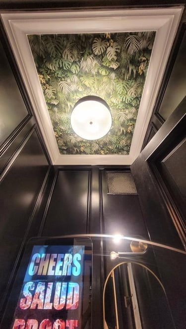 Tapety tropického vzoru na stropech toalet v baru Mezcalero v Torontu. Tahle prácička byla opravdová hubička.