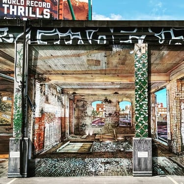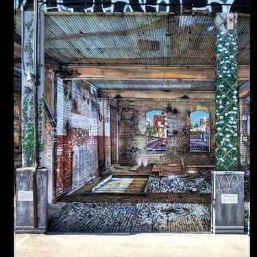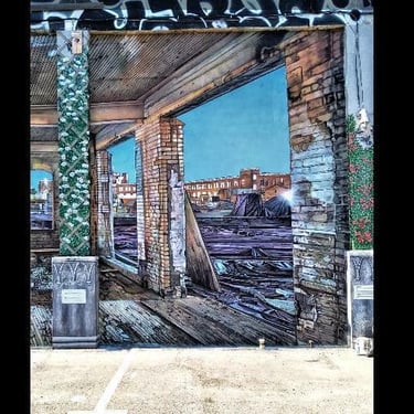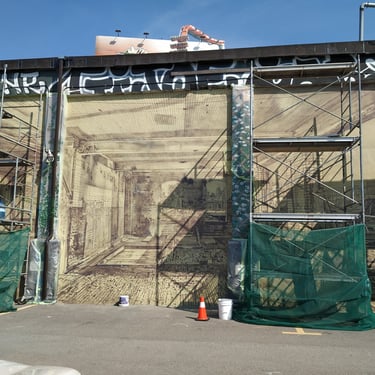 Průčelí polorozpadlého baráku. Zde jsem vypomáhala. Autorem díla je někdo jiný.